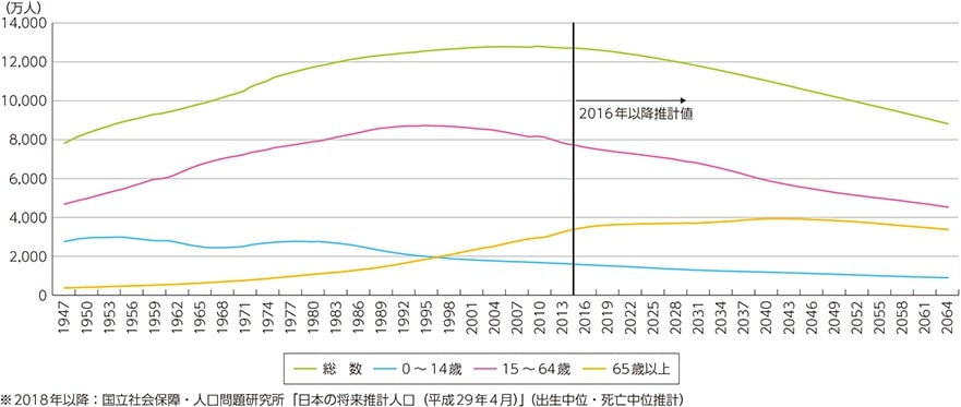 我が国では、少子高齢化が急速に進展した結果、2008年をピークに総人口が減少に転じており、人口減少時代を迎えている。国立社会保障・人口問題研究所の将来推計によると、2050年には日本の総人口は1億人を下回ることが予測されている。