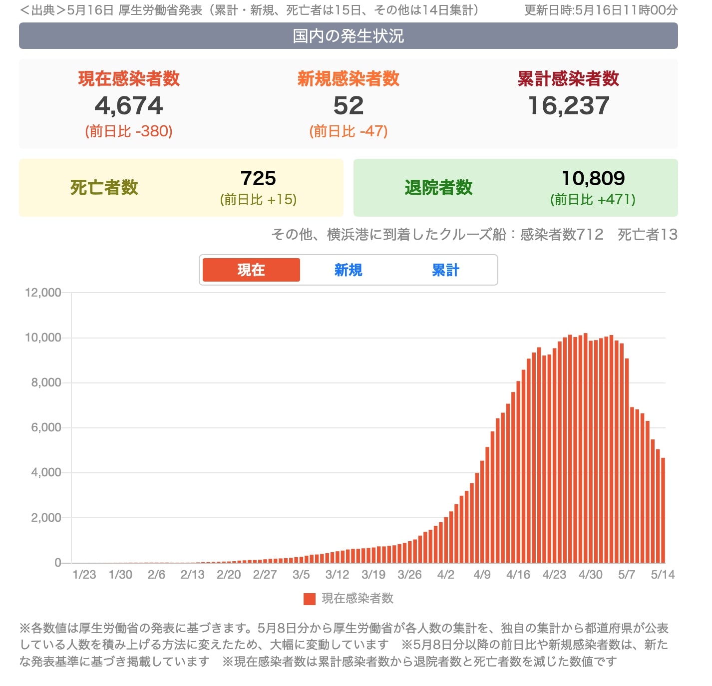 2020年5月16日現在、日本で新型コロナウィルスに感染されれおられるのは累計で16,237人(これまでにお亡くなりになられた方725人、退院者数10,809人)です。